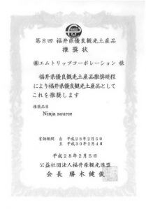 「福井県優良観光土産品」としてNinja Saurce(ニンジャソース)が推奨されました。写真は福井県観光連盟様からの推奨状です。