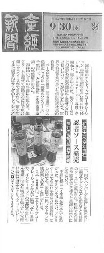 産経新聞にニンジャソースが掲載されました。「和洋中いずれの料理にも使える。生クリームと混ぜて加熱するだけで魚介類にあうソースが出来上がる。酢やオイルと混ぜればサラダのだレッシングに、肉やハンバーグを焼いた後の肉汁に混ぜてレモンなどを加えると肉料理のソースにと変幻自在。単体でも蒲焼や煮魚に使うと奥深い味わいに」と書かれています。