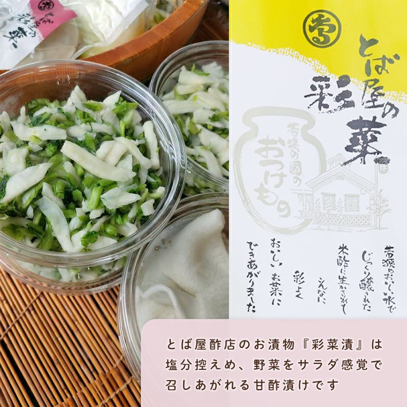 彩菜漬は、とば屋酢店がお届けするお酢で漬けたお漬物です。大根・白菜・かぶら・らっきょう・大豆など、新鮮な国産野菜をあっさり、さっぱり甘酢で漬け込んでいます。お新香、お茶漬、酒の肴に。酢や塩、砂糖の加減を調整しているので、パクパク食べられます。常備菜にいかがですか。